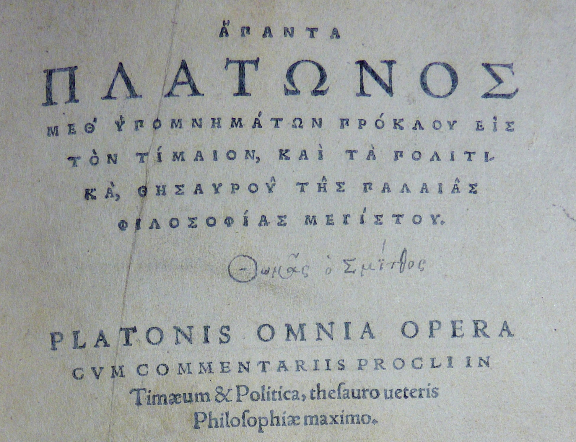 Title page of “Hapanta Platōnos … Platonis Omnia opera” with the signature of Sir Thomas Smith
