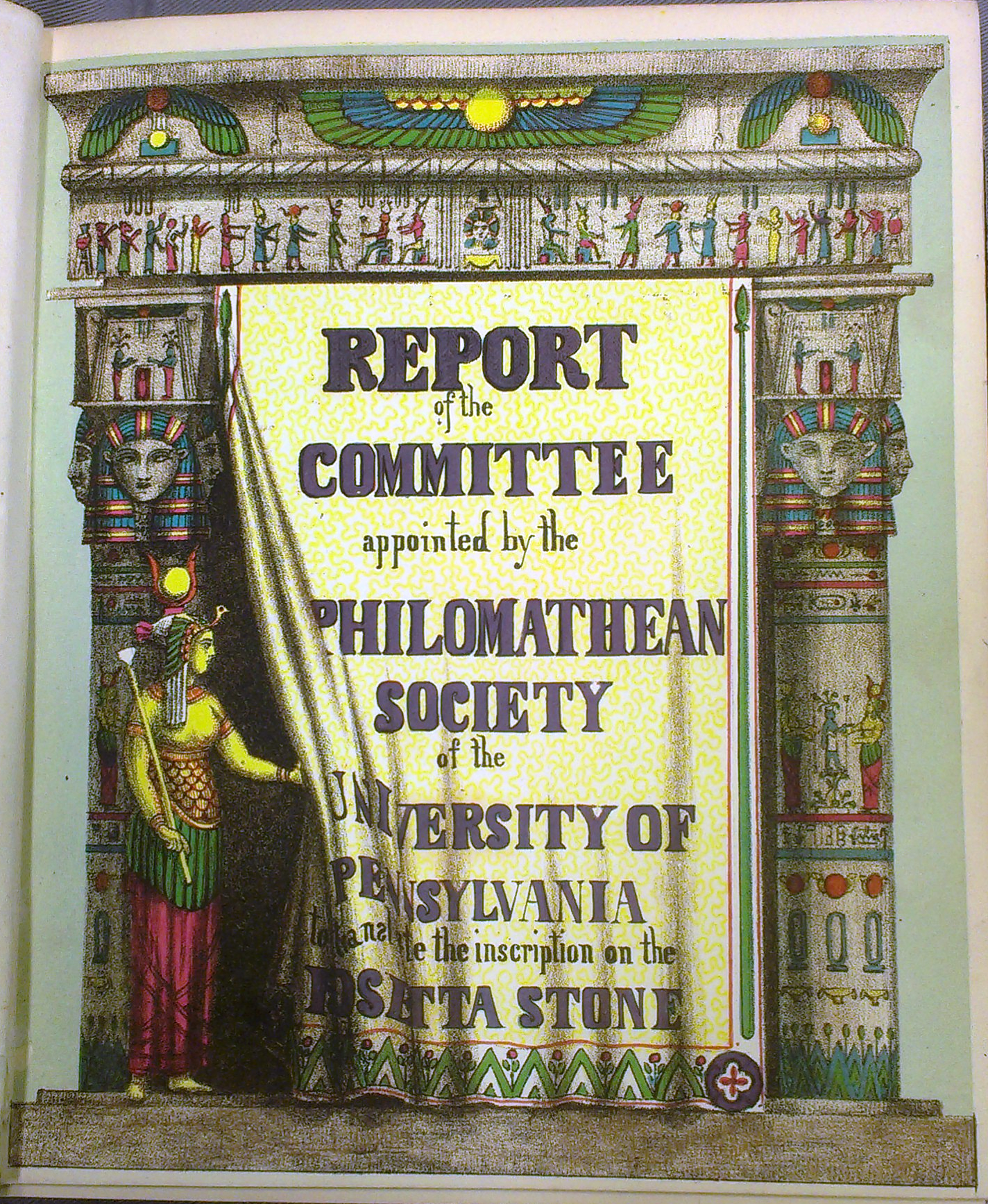 In 1858 Henry Morton, Charles R. Hale, and S. Huntington Jones, three undergraduate student members of The Philomathean Society at the University of Pennsylvania, published the first complete and direct translation of the Rosetta Stone from its trilingual inscription into English. They had spent the last two years deciphering the ancient Hieroglyphics, Greek, and Demotic text from a plaster cast of the Rosetta Stone, and in doing so they deciphered characters that had not previously been defined. They privately published their findings in this stunning and highly decorative chromolithographic publication, the first American book to be printed entirely by lithography. Their work was met with worldwide praise and recognition.
