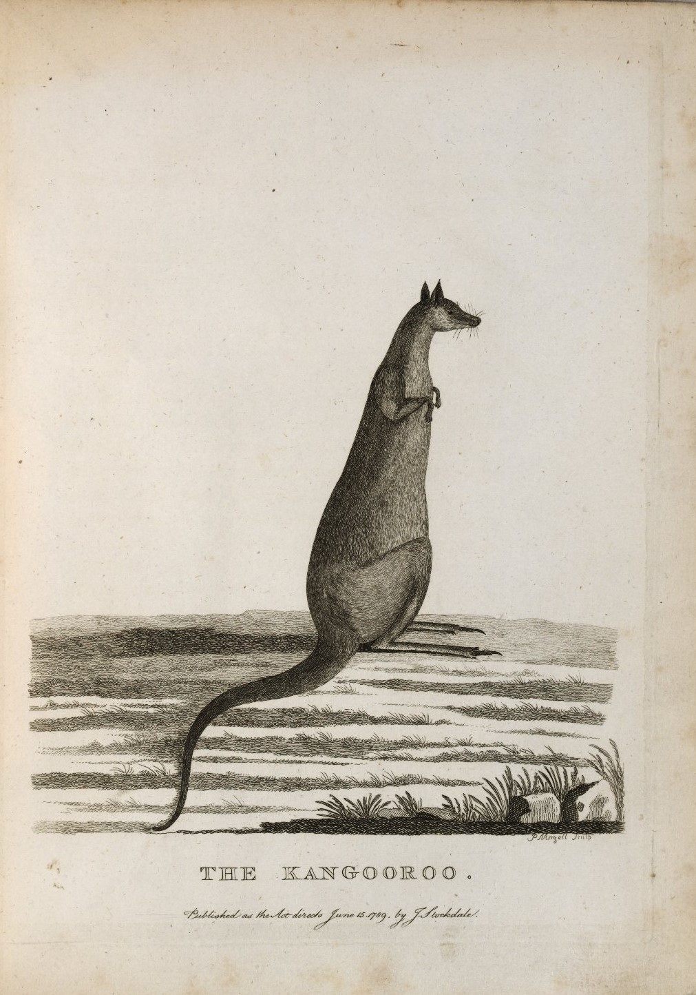 Australia’s geological isolation and climatic events has resulted in a unique ecosystem. The overwhelming majority of fauna found in Australia is endemic to the country. We can only begin to imagine what the early colonists made of these weird and wonderful creatures. However, much like Herbert’s dodo and it’s falconesque beak, the artist has used the features of more familiar animals as reference points. As a result, the kangaroo has a distinctly shrew-like snout. It also sits flat on the ground, whereas real life kangaroos use their tails for balance. The drawing of the Wulpine Opossum, or as it is known today, the Common Brushtail Possum, is also far more reminiscent of the European pine marten than it is of a possum. However, compared with the following illustrations, it is at least possible to identify these animals as being a kangaroo and a possum.