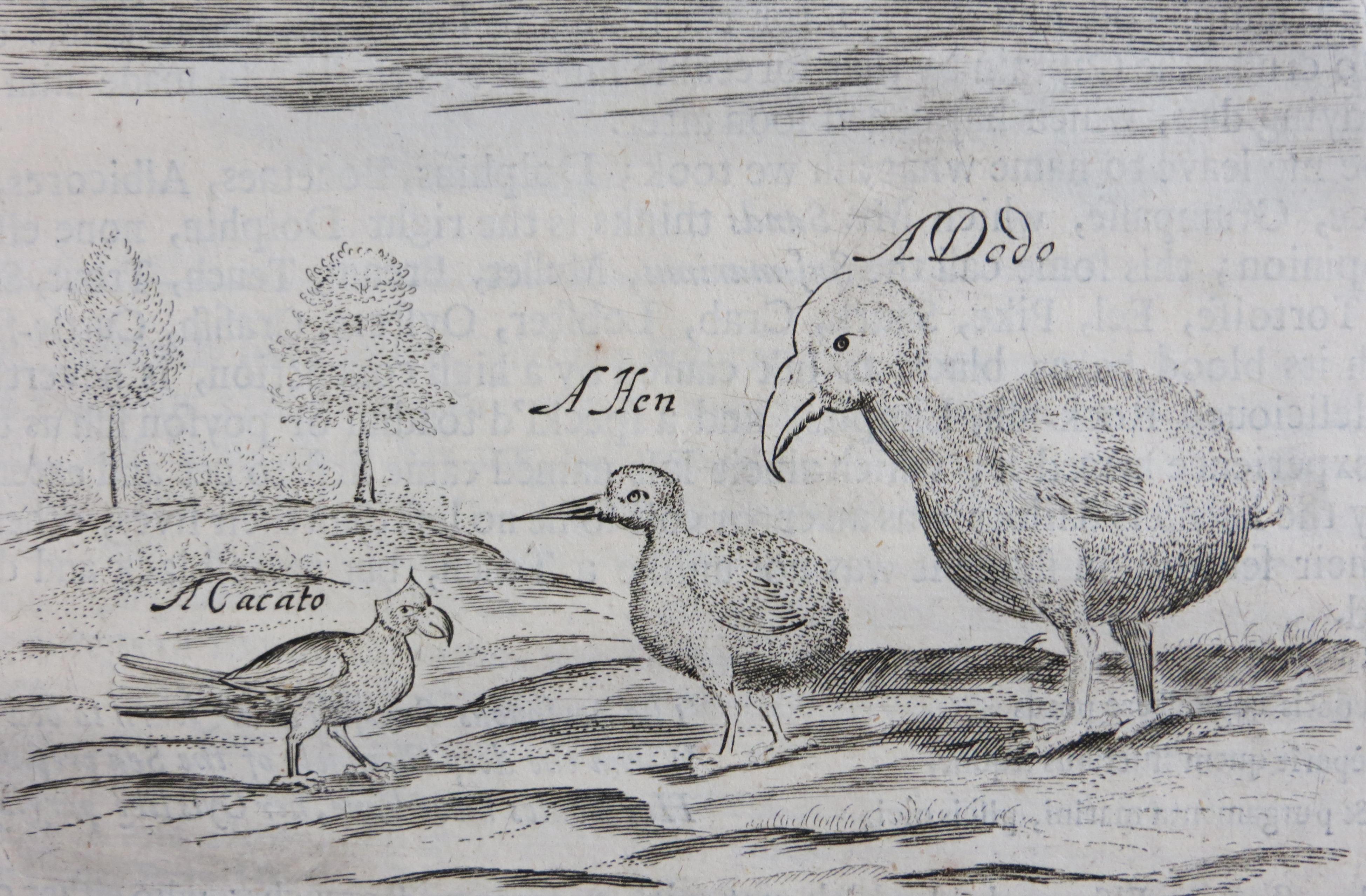Sir Thomas Herbert was one of the few who did make a visual record of the dodo during his travels to Mauritius in 1629. His encounter with the dodo, alongside a drawing, can be found in his book Some Years Travels into Divers Parts of Africa, and Asia the Great (LPL, B13.5/H41), first published in 1634. However, despite having seen live dodos in the wild, Herbert’s attempts to capture their likeness left a little to be desired. In his drawing, the beak is noticeably raptor like, starkly different from the long, hooked beak seen in skeletal remains.