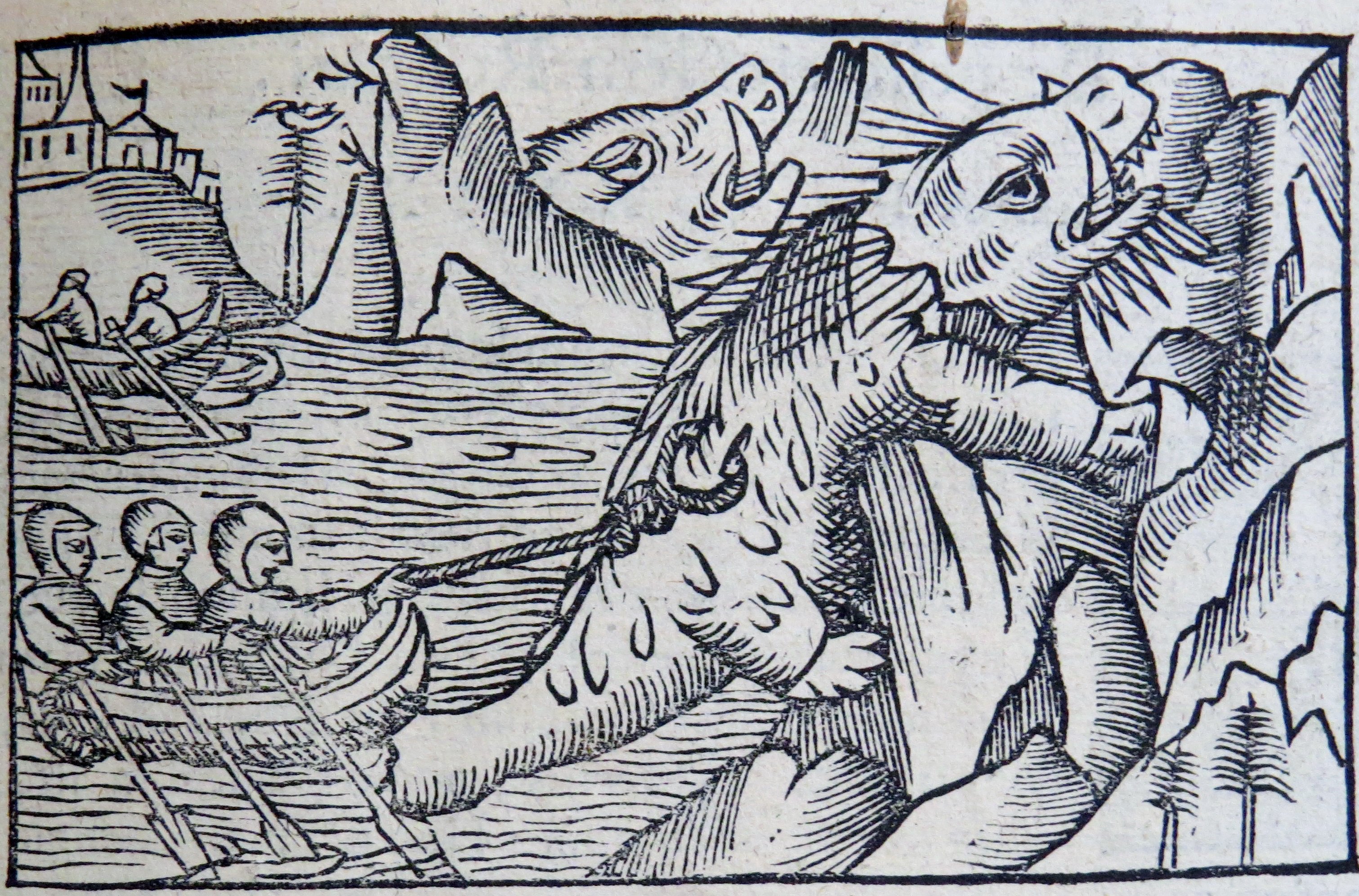Reuwich wasn’t alone in trying to make his illustrations appear more exotic. Olaus Magnus, the exiled Archbishop of Uppsala, Sweden, had an apparent fascination with walruses and included several of them in his work. However, we would be forgiven for thinking that these walruses were in fact some mythical sea monster of Magnus’ own creation. In his Historia de Gentibus Septentrionalibus (LPL, B64.1/M27), first published in 1555, a boar headed monster with four pronounced legs can be seen scaling the cliffs as it is hunted by some sailors. To say that it bears little resemblance to an actual walrus would be an understatement.