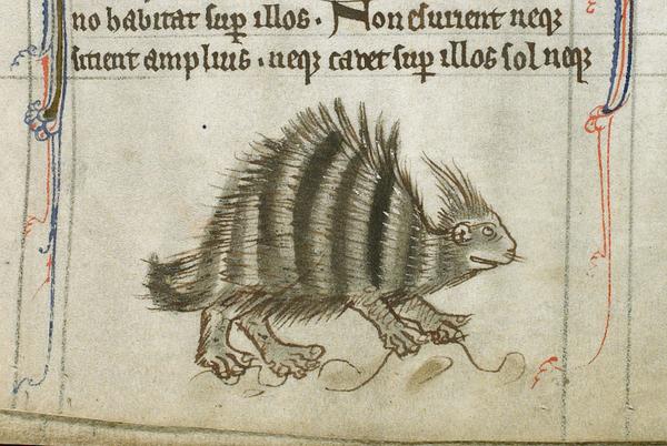 Our look into the fantastic beasts of Lambeth Palace Library has taken us across the globe, from Australia’s arid outback to the polar seas. While it may be suggested, and with good reason, that some of the animals shown above were victims of an artist’s overactive imagination, they are a fascinating insight into the known world at various points in history. We’ll conclude this blog post with a look at the Lambeth Apocalypse (LPL, MS 209), written in the late thirteenth century. Nestled in one of the margins we find a little porcupine. There isn’t much more to say about him, except, just look at those toes!