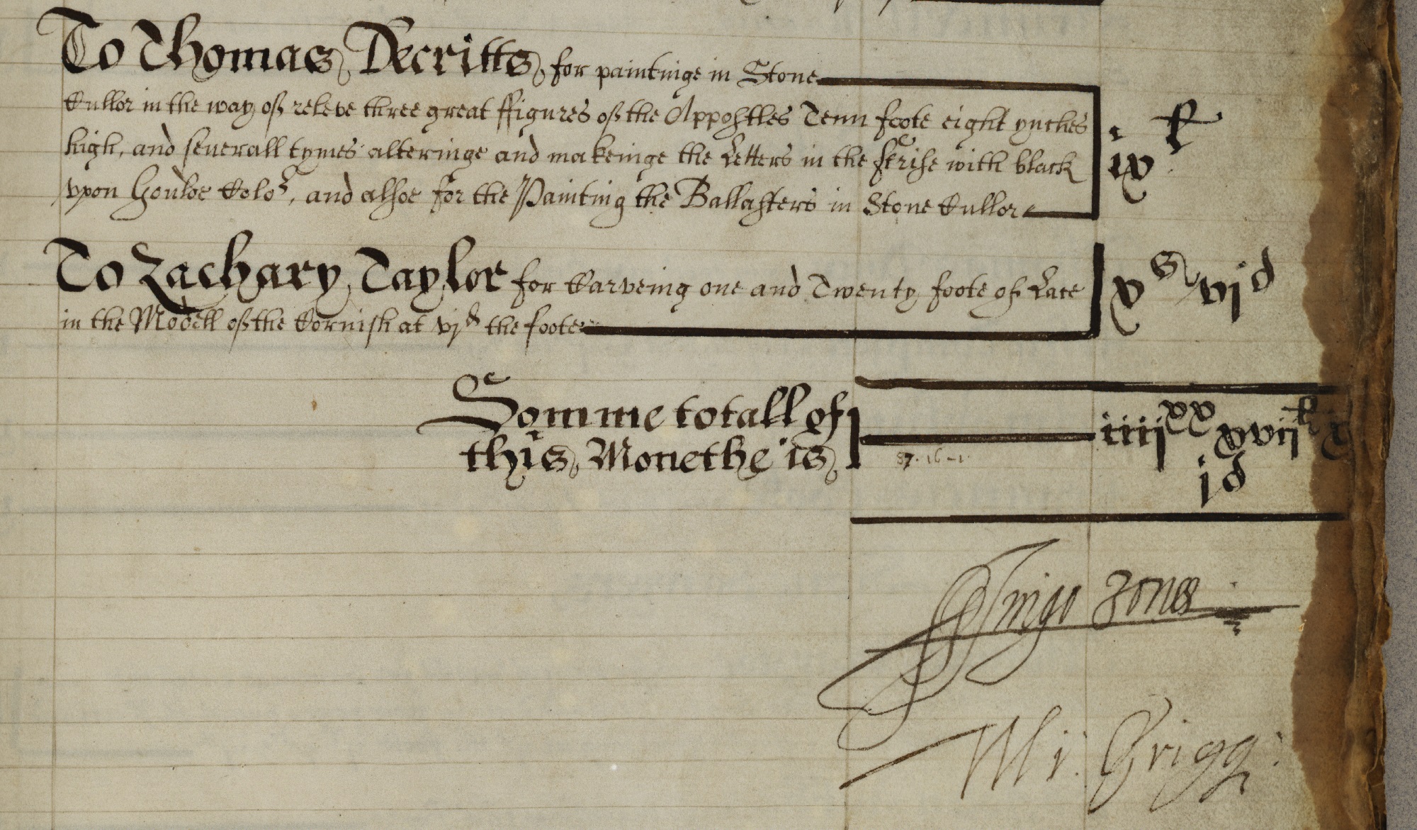 Both Charles I and Laud would finance Jones’ restoration of Old St. Pauls, however, the king decided that he alone would pay for the construction of the classically designed West Front. Accounts, such as the one included below, give us a fairly accurate idea of how funds were distributed. In this particular example, (LPL, FP 43: October 1639-September 1640), we see Jones’ own signature as he approves payment to a certain William Decritts for his frieze paintings.