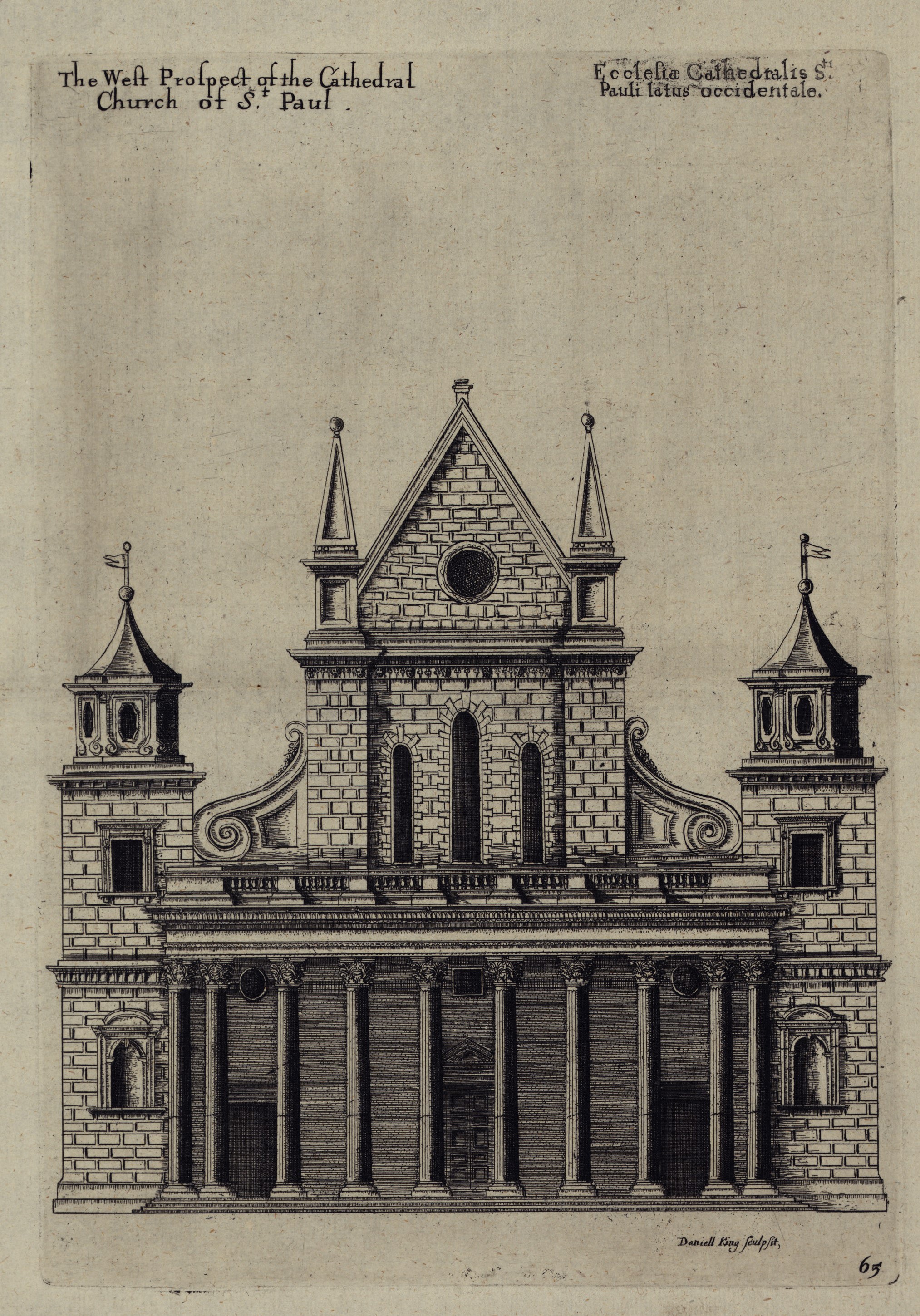 Concerned by this rapid deterioration, James I appointed Inigo Jones to oversee the reconstruction of Old St. Paul’s. Unlike the traditional master craftsmen of yesteryear, Jones was the first person to fully break with the traditional approach to building design and is recognised as England’s first significant architect. In addition to the reconstruction of many of the Gothic features of Old St. Paul’s, Jones stamped his own identity on the building with the inclusion of several classical elements. He drew inspiration from his trips to Italy and led the revival of classical designs from Rome and the Italian Renaissance in Britain. This influence can clearly be seen in the image below, ‘The West Prospect of the Cathedral Church of St. Paul’, which has been taken from Daniel King’s The Cathedrall and Conventuall Churches of England and Wales (1656), (LPL, H5194.K5).