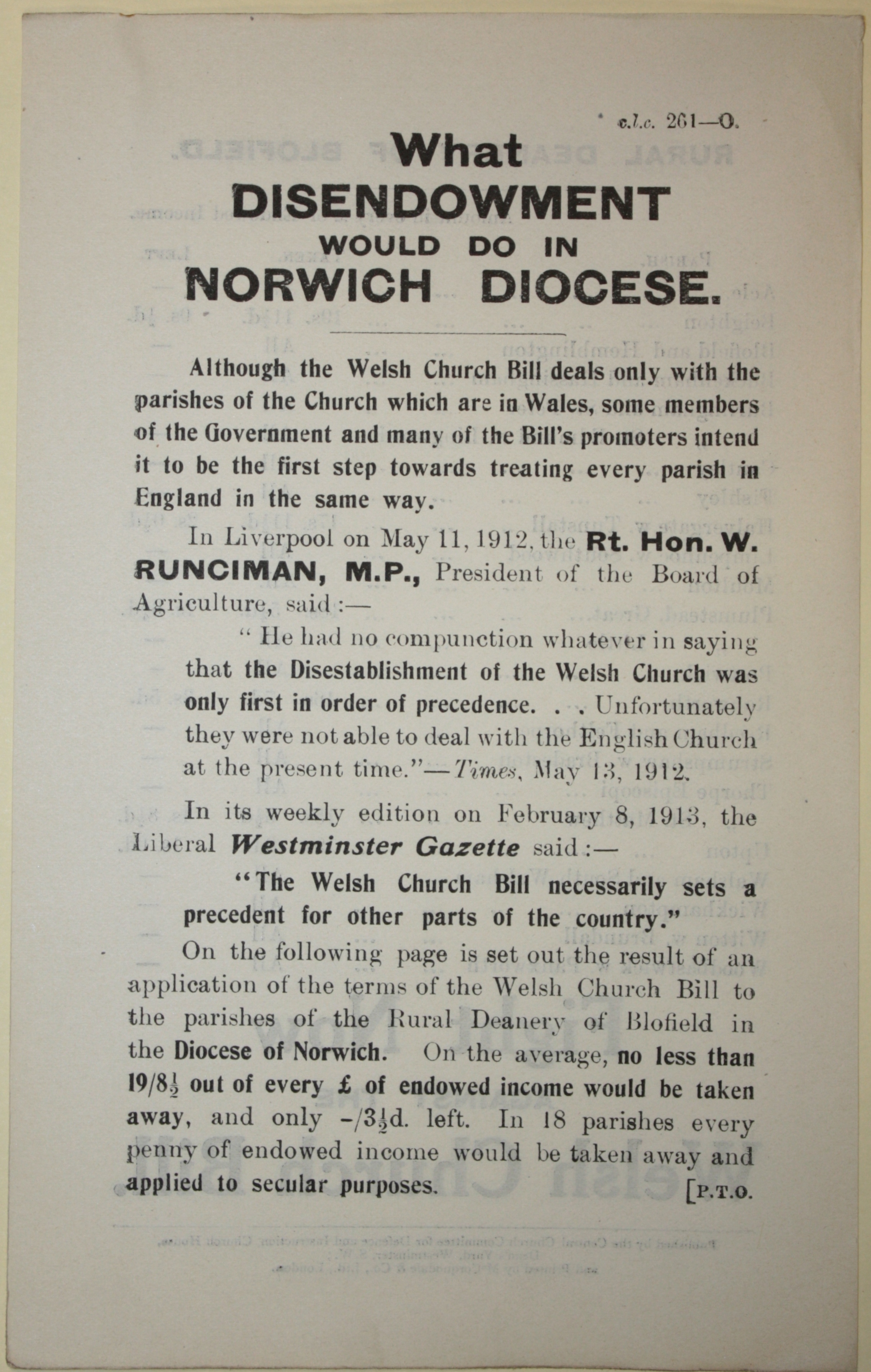 Issues of national importance were tackled by the CDI from its London Committees, and campaigning against Welsh Disestablishment was its focus for many years. An example of this can be seen in the leaflet below highlighting the financial difficulties disestablishment would cause, reproductions of which were distributed to all dioceses c.1913-14; just one of many books and pamphlets they produced. Indeed, the Central Church Committee (founded in 1893 by the then Archbishop of Canterbury, Edward Benson), which was formed solely to fight against Welsh Disestablishment, merged with the CDI in 1896. The two bodies together became known as the Church Committee for Church Defence and Instruction, and later, in 1908, simply the Church Committee for Defence and Instruction.