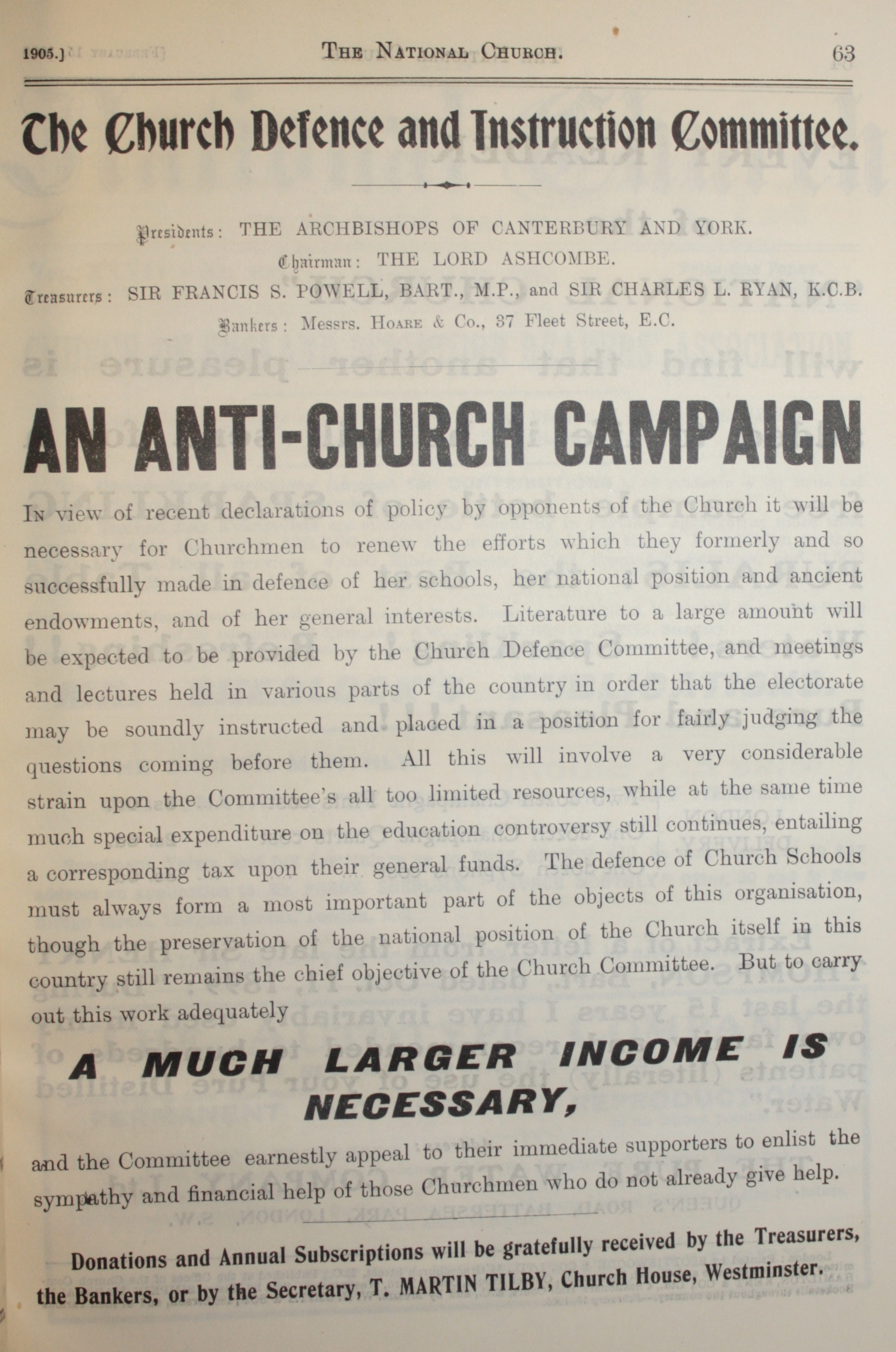 The need to defend the established Church can be also seen in the CDI’s moves to resist legislation reforming church rates, education, tithes and burials. Many of these Bills were instigated by nonconformists, whose influence was growing in Britain in the late nineteenth and early twentieth centuries, spearheaded by the Liberation Society which aimed to separate Church from State.