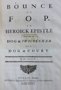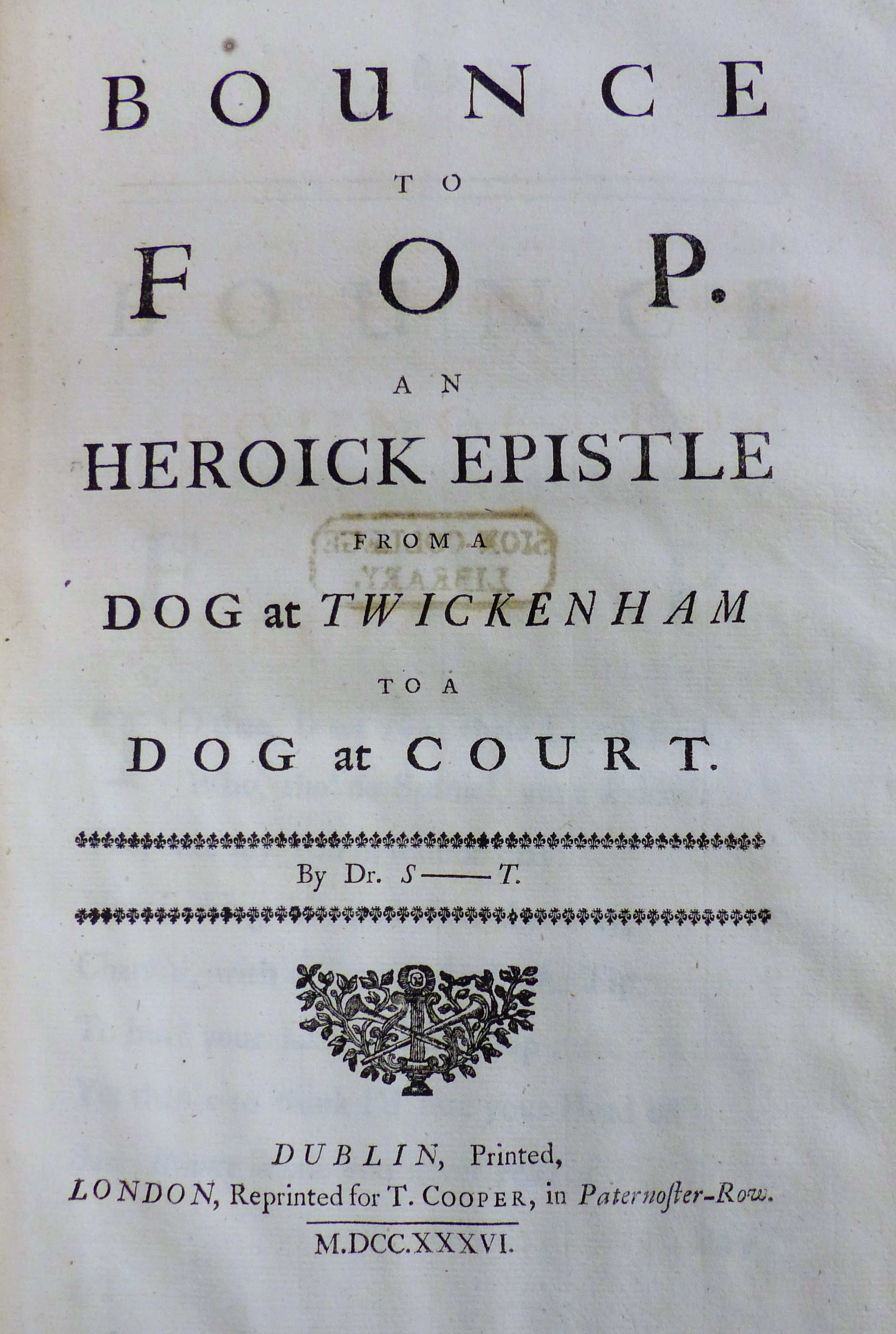A. Pope, Bounce to Fop: An heroick epistle from a dog at Twickenham to a dog at court (Dublin, 1736) [LPL classmark [P]72.H 18.06]
