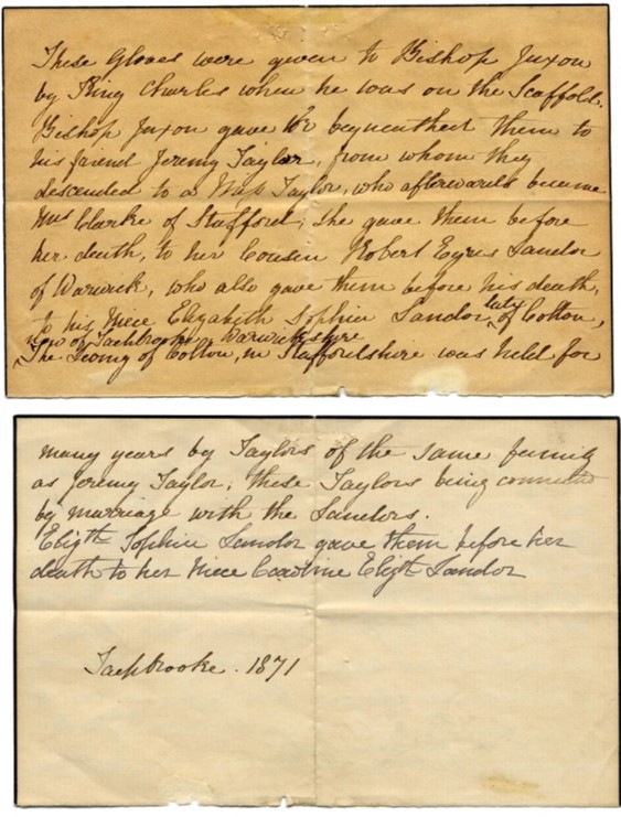 While we cannot be certain that Charles I wore the gloves, we can be reasonably certain that the gloves were owned by Juxon. He gave them to his friend Jeremy Taylor, through whom they eventually came into the Landor family. Papers housed with the gloves trace the path the gloves took through the Landor family.[2] In 1928 Miss Caroline Landor gave the gloves to RUSI.
