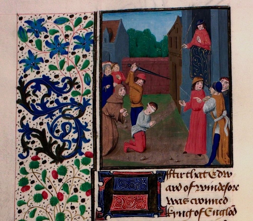 This small vignette from the St. Alban’s Chronicle (MS 6, f. 167v) purports to show the death of Llywelyn ap Gruffudd, last native Prince of Wales, on 11 December 1282. Although the image shows a formal execution scene with a priest in attendance, the text of the Chronicle relates that Llywelyn was killed in an ambush or scuffle: And when Ƿe prince Lewellin his broǷer Ƿat wist he was sore abashed for he had no power to may[n]teyn werre And Ƿen he fled & wend wele to haue scapid but Thomas mortymer in a morning wt v. knightes met hym alone & hym clipped round about & toke hym and smote of his hed and it presented to Ƿe king. And Ƿus was Lewellyn hedid & he & his heires disherit for eu[er]more be rightfull Jugement.(f.169). This short text differs from that found in other manuscripts of the Brut where Llywelyn’s killer is named as Sir Roger de Mortimer assisted by ten knights [The Brut, ed. Friedrich W.D. Brie, Early English Text Society, 1906, reprinted 1960, p.183]. The fate of Llywelyn’s head, which was exhibited crowned with ivy at the Tower of London, has an ironic, though possibly unconscious reference to the ancient Welsh ‘Tale of Branwen’, the second branch of the Mabinogi, in which the head of Brân the Blessed was taken to the White Hill in London to protect the country from invasion. The St. Alban’s Chronicle is part of the core collection of manuscripts bequeathed to Lambeth Palace Library by Archbishop Bancroft. It is a deluxe copy of the prose Brut, a popular mediaeval chronicle recounting the history of Britain from the legendary times of Brutus, great grandson of Aeneas. MS 6 dates from the last quarter of the fifteenth century and was probably written by an English scribe; the text interspersed with illuminations relating to the action of the narrative probably produced in Bruges. The entire manuscript has been digitised and is available in ‘turn the page’ format on the Library’s online image gallery.