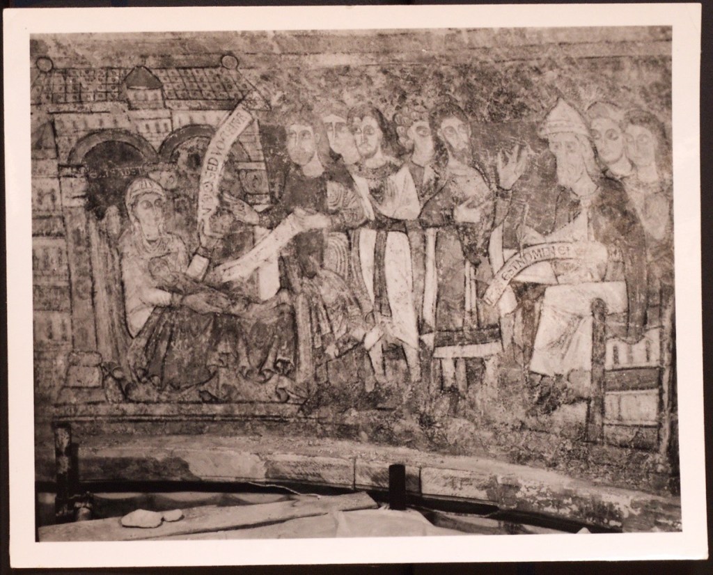 Many cathedrals employed the help of Mrs Eve Baker, her husband Professor Robert Baker and her team. They painstakingly restored wall paintings from Durham to Winchester and Hereford to Norwich. Her work was generally considered to be beyond compare but her estimates were often optimistic. Many files contain Deans despairing at the unexpected expense. This work was often paid for by grants from the Pilgrim’s Trust which meant repeat applications were often required to compete the restoration of wall paintings in a single chapel. Her work sometimes even discovered new wall paintings hiding under more recent ones.